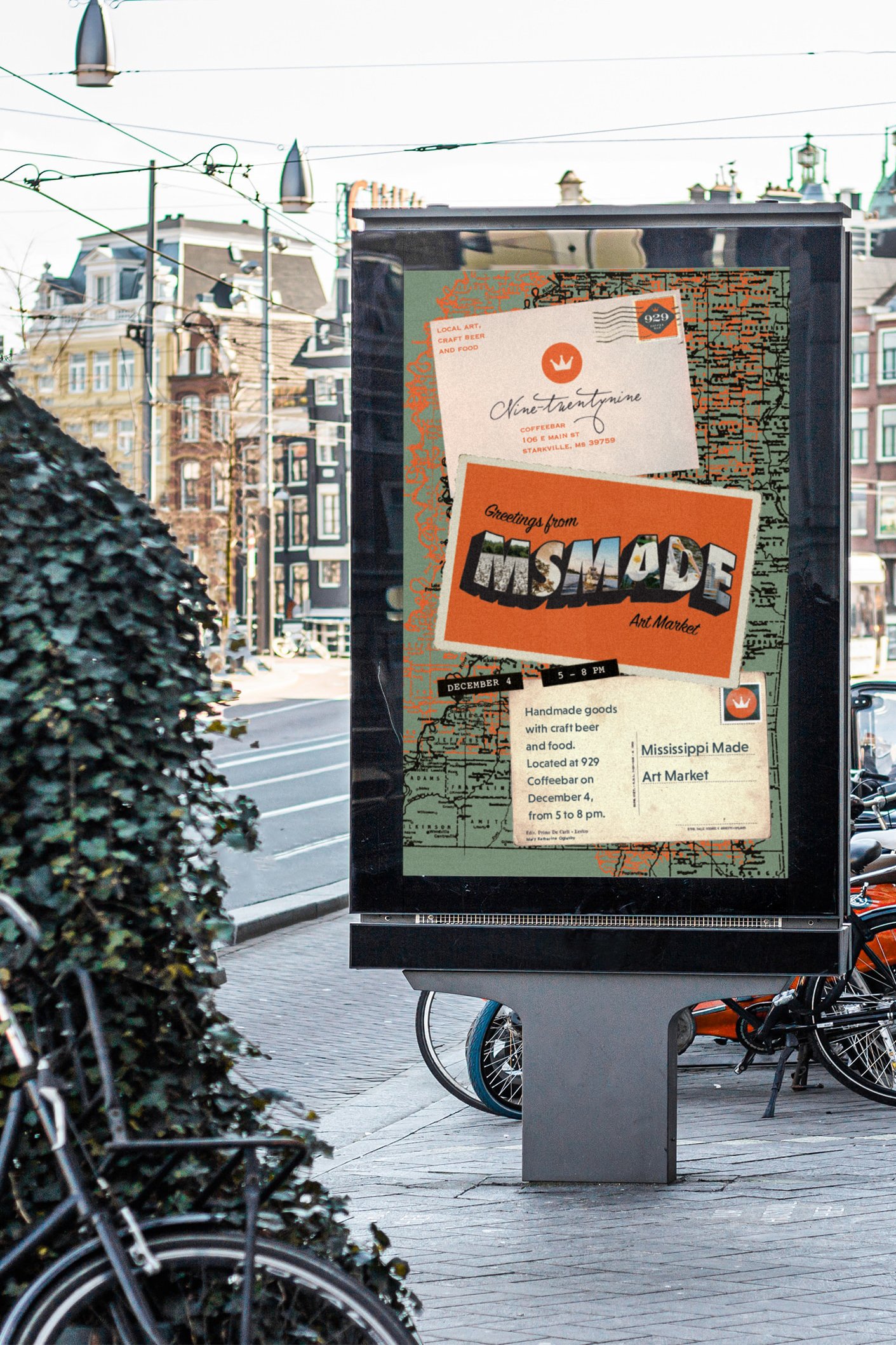 Mississippi Made is an annual market for local artists hosted by 929 Coffee Bar in Starkville, MS. 929 had a poster competition to locally promote the event. The poster I designed came in 3rd place and was featured in the coffee shop during the event (image below is a mockup and not a photograph from the event).