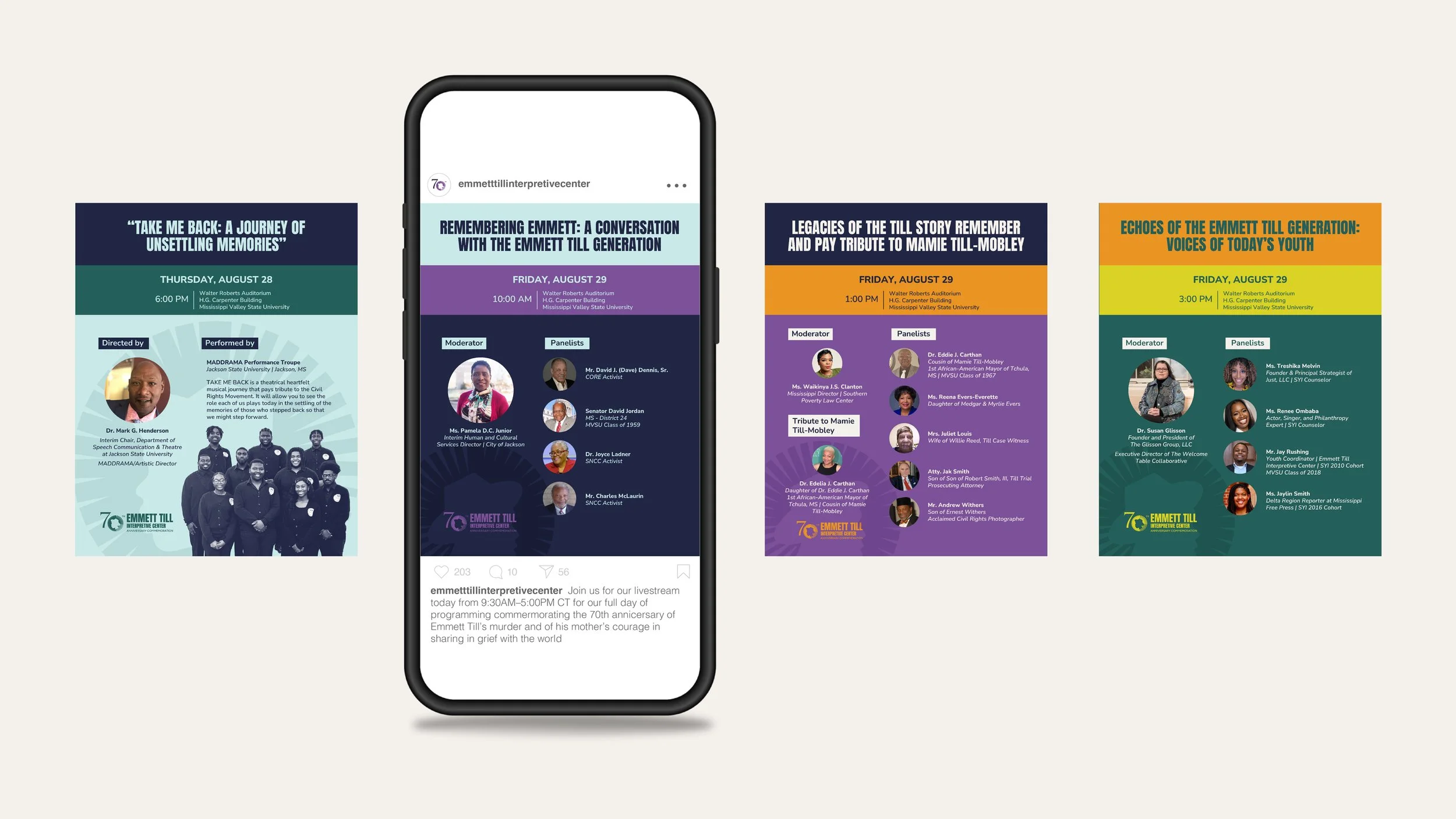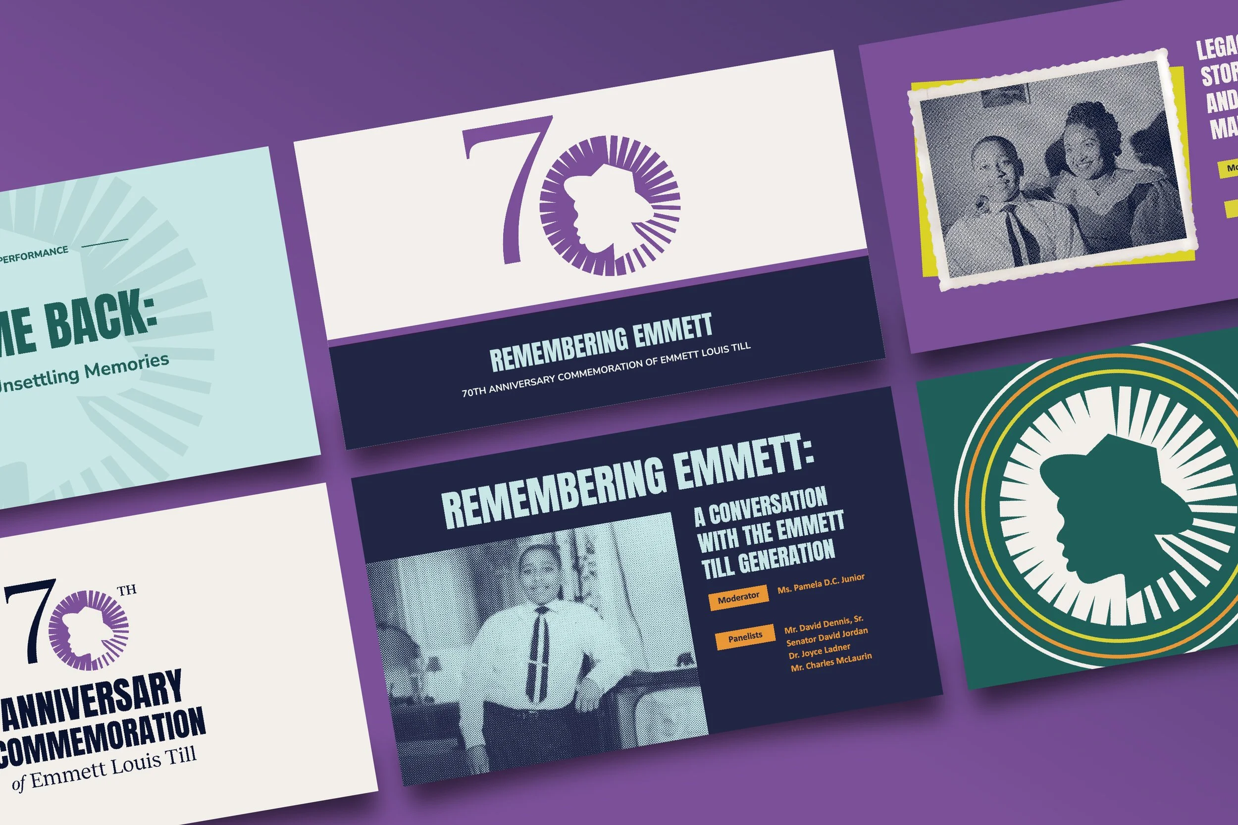 Since ETIC has limited photos, I was brought into this project to create a collage originally for the anniversary events booklet, but was later turned into a poster series. My illustrations of Emmett and his mother, Mamie Till-Mobley, were also used throughout the project in the memorial program, buttons, and t-shirt designs.